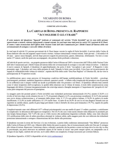 Caritas Roma ha publicado el informe “Acoger ya es curar”, dedicado a los veinte años del servicio Heridas Invisibles, un programa de atención a migrantes supervivientes de tortura, violencia intencional y traumas extremos. En estas dos décadas, el centro ha asistido a 531 personas procedentes de 61 países, consolidándose como un referente técnico reconocido incluso por Naciones Unidas. Sin embargo, el informe vuelve a mostrar una tendencia creciente en ciertos ámbitos eclesiales: la adopción casi literal del lenguaje de los organismos internacionales, que tiende a desplazar el marco espiritual y evangelizador propio de la Iglesia.